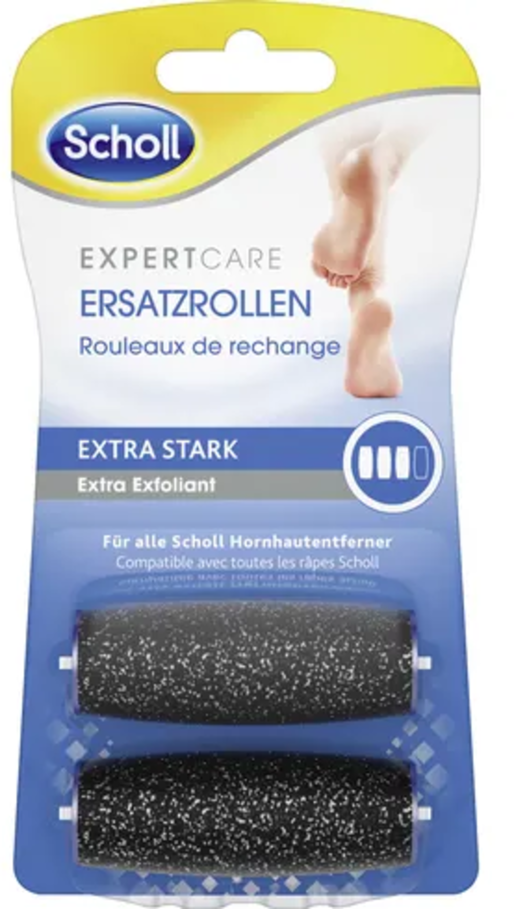 Резервните ролки ExpertCare Extra Stark са подходящи за всички уреди за премахване на загрубяла кожа Scholl. Те са предназначени най-вече за употреба върху петите при твърда и суха кожа на стъпалата. Ролките имат екстра силна грапавина и могат да се използват както върху мокри, така и върху сухи стъпала.