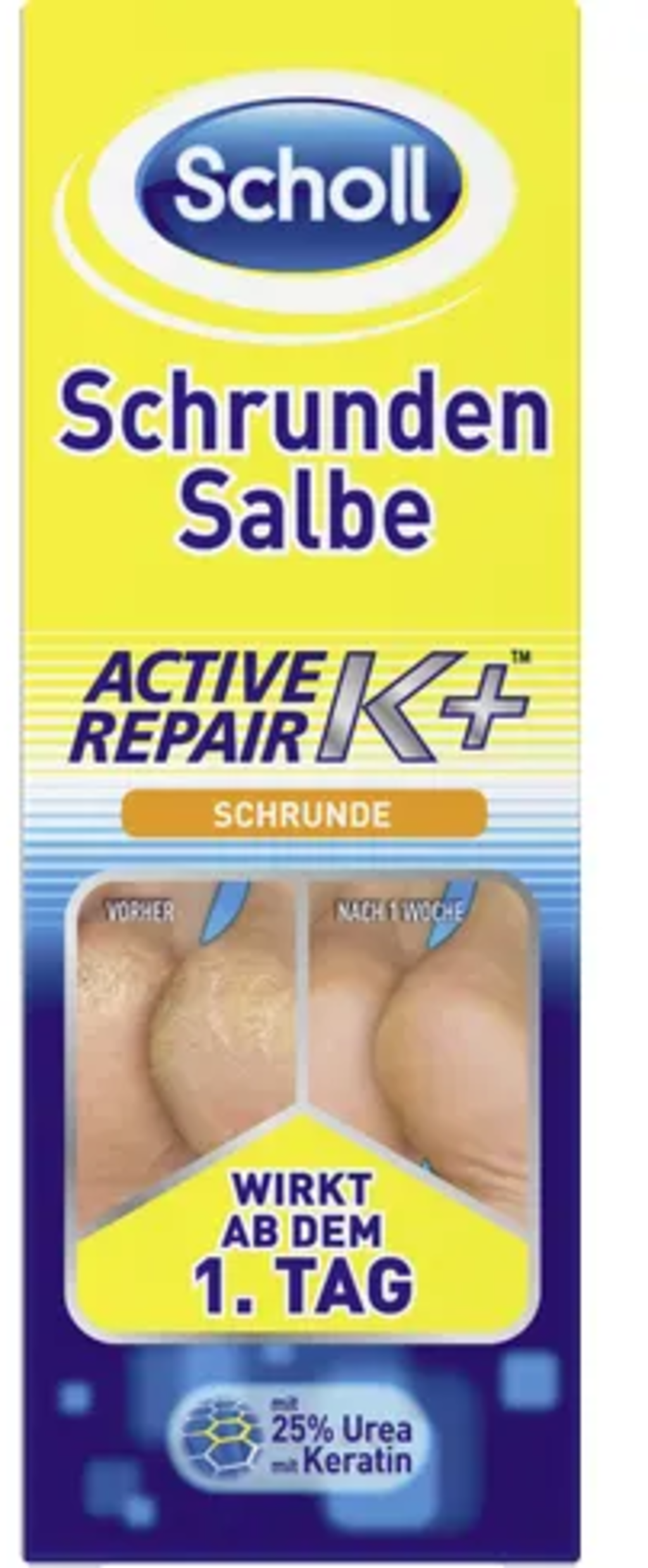 Мехлемът за напукани пети Active Repair K+ е обогатен с кератин и се грижи оптимално за много сухи и напукани стъпала. Попива бързо в кожата, осигурява важна хидратация и е без парфюм.