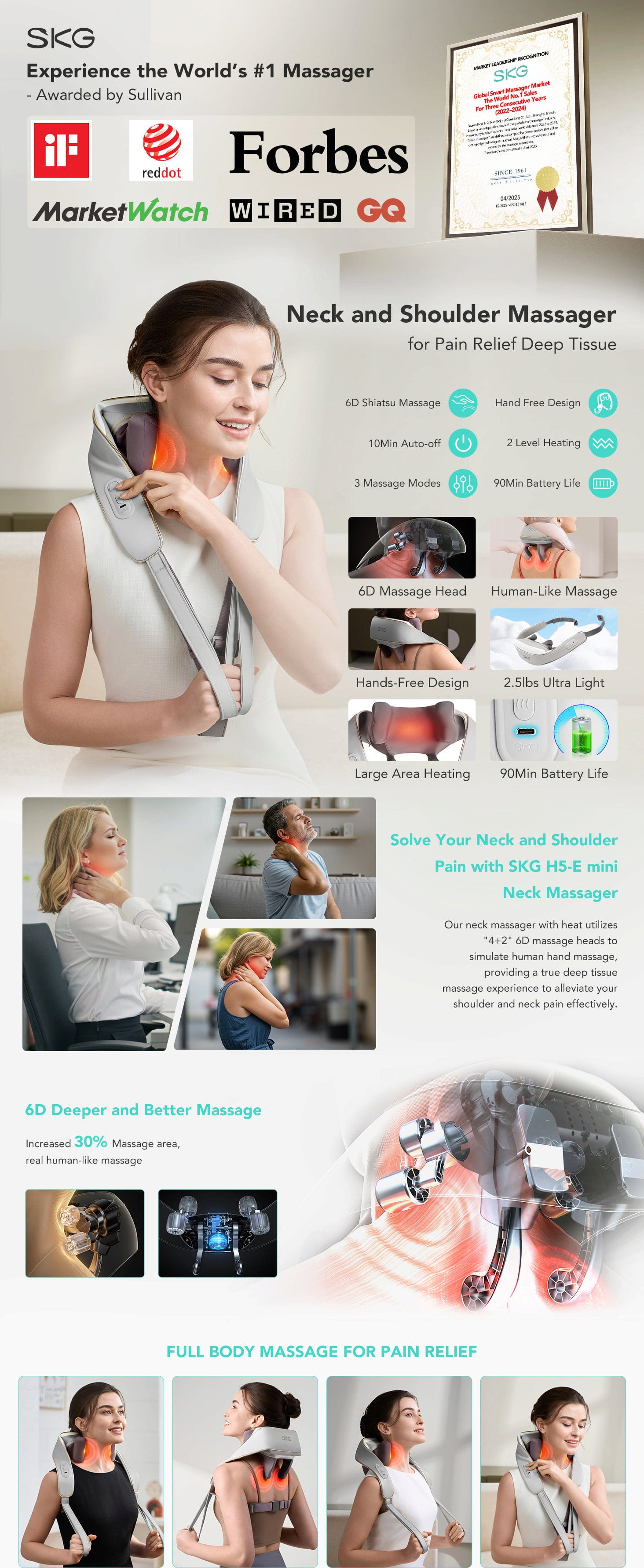 SKG H5 Mini се отличава с особено компактен дизайн, разработен специално за лесно и практично пренасяне. Благодарение на безжичната технология с акумулаторна батерия, устройството може да се използва навсякъде – по време на почивка в офиса, след интензивна тренировка или по време на пътуване. Прецизните механични движения на шиацу техниката са проектирани да въздействат целенасочено върху мускулатурата на врата и раменете.