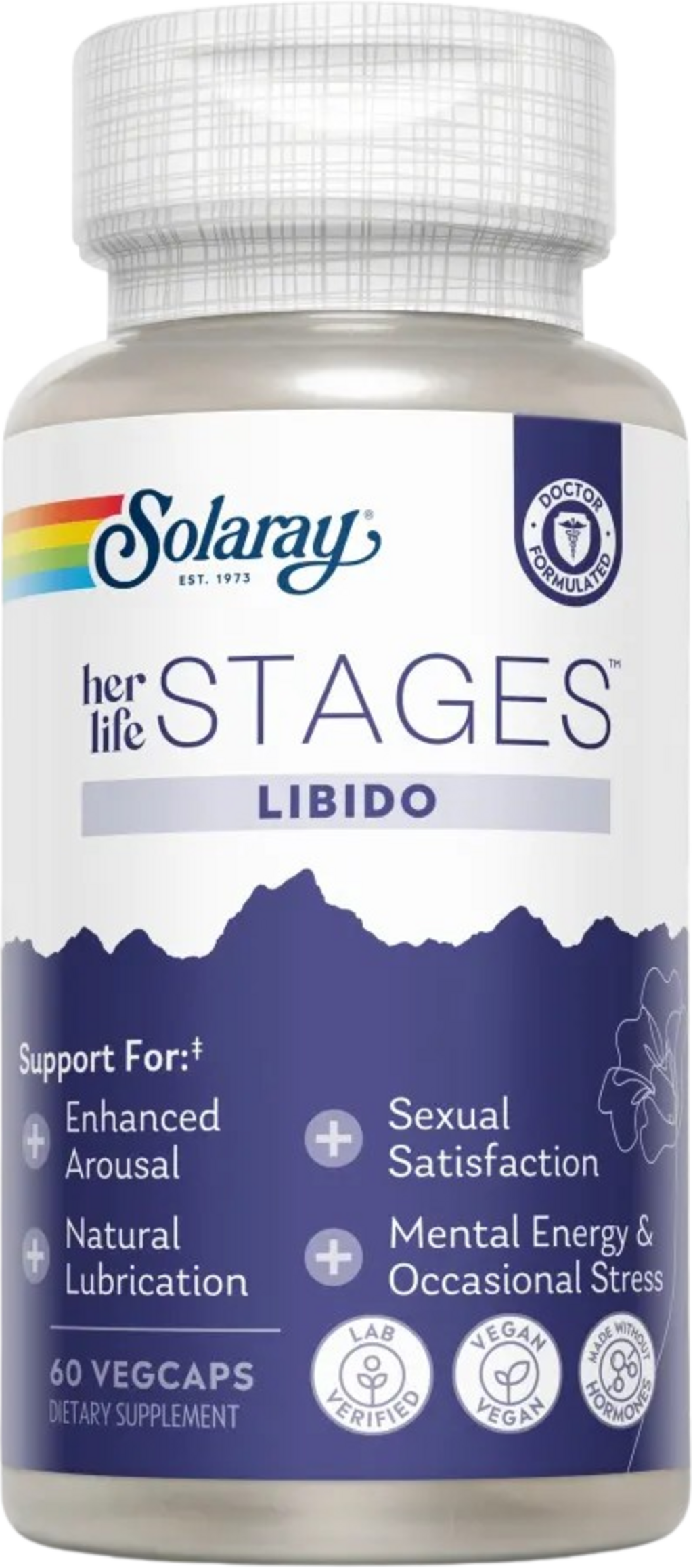 Solaray Her Life Stages Libido съчетава внимателно подбрани растителни съставки с първокласно качество. Сред тях е и доказаният KSM-66® екстракт от корен на ашваганда – едно от най-изследваните адаптогенни растения. Формулата е напълно без хормони, без соя и без изкуствени добавки, което я прави подходяща за жени във всички етапи от живота. Веган капсулите са лесни за прием и се вписват удобно във вашето ежедневие.