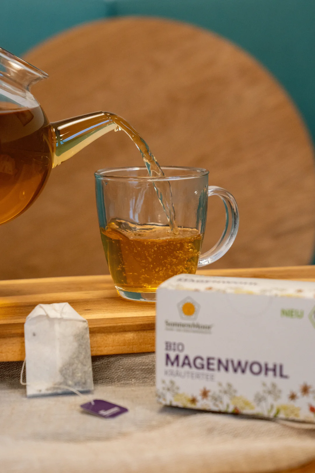 Био билковият чай Bio Magenwohl от SonnenMoor съчетава 14 внимателно подбрани билки като бяла мъртва коприва, маточина и лайка. Висококачествените суровини идват от био фермери в австрийския район Mühlviertel и се обработват без изкуствени аромати. Допълнена с анасон и копър, тази смес предлага автентично вкусово изживяване за ежедневната рутина. Благодарение на регионалното производство и био сертификацията, този чай е натурален спътник за приятни чаени моменти.