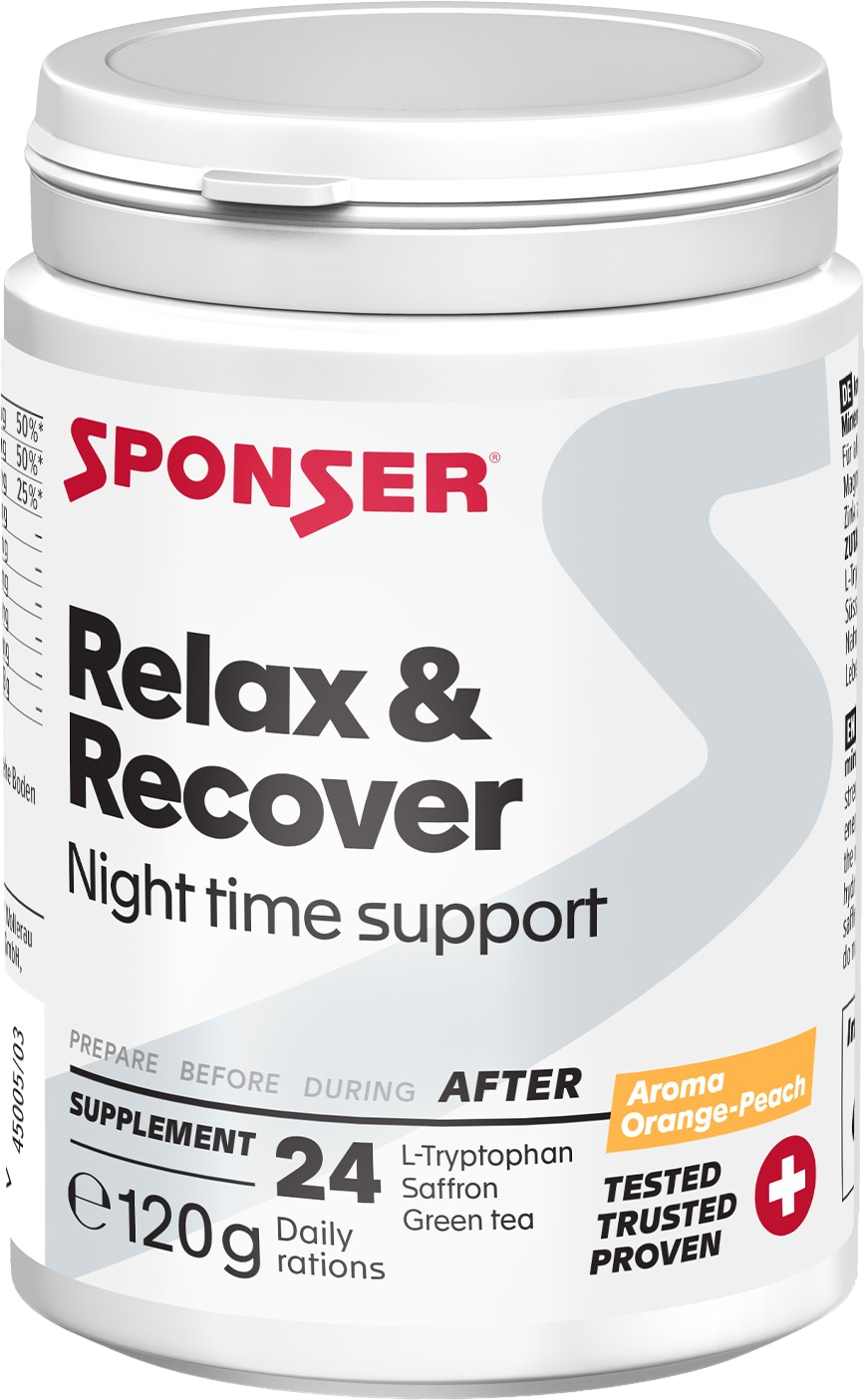 Прахът Relax & Recover от Sponser® Sport Food съдържа ценни съставки, които са особено полезни вечер. Това е естествен растителен и млечен протеинов продукт, който съдържа желязо, цинк и магнезий. Прахът може да се консумира след усилена тренировка, предизвикателно състезание, както и след стресови събития (работа, обучение, изпити и др.).