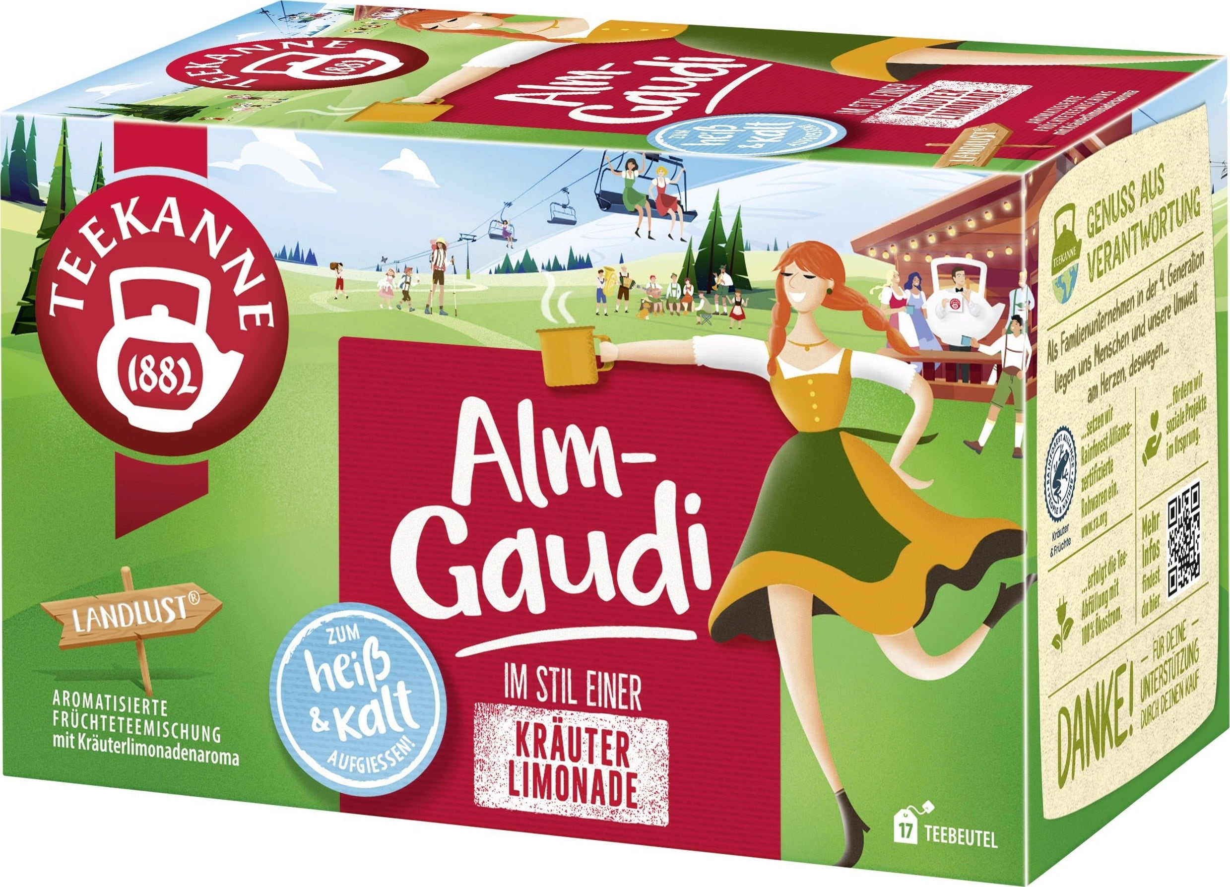 Подарете си вкус на австрийска радост - във всяка чаша! Вкусът на TEEKANNE Landlust Almgaudi е точно като на пътуване до легендарните високопланински пасища на Австрия: тревист, свеж и пълен с аромат. Наслаждавайте се на него горещ като сгряващ билков пунш или студен като освежаващ билков шприц - този чай е идеален за всеки сезон. Със своя уникален вкус на свобода, природа и алпийски чар той пренася неповторимото усещане за планинското очарование на Австрия директно в дома ви.