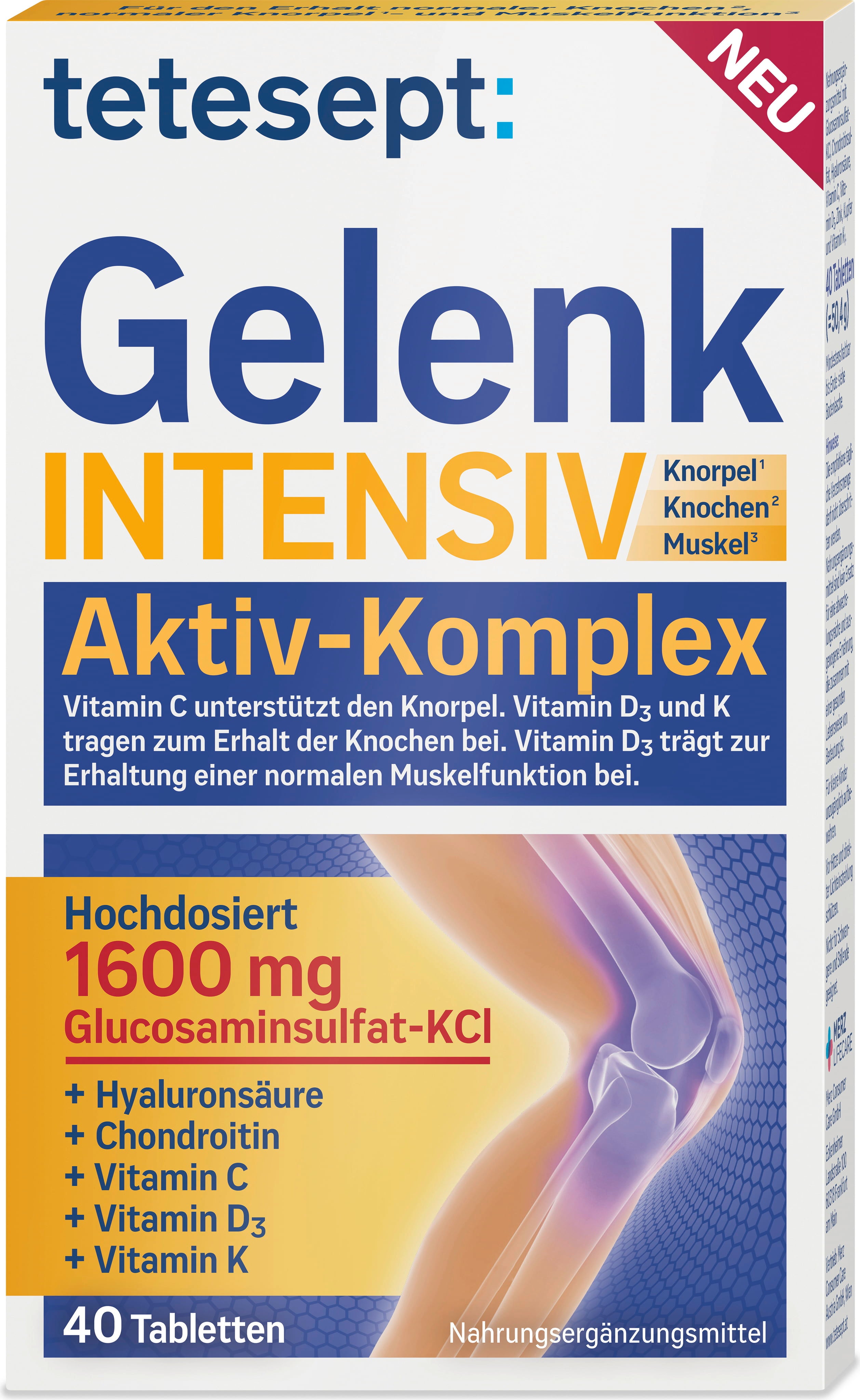 Интензивният активен комплекс за стави от tetesept съдържа комбинация от глюкозамин сулфат–калиев хлорид, хиалурон, хондроитин, цинк, мед и ценни витамини.