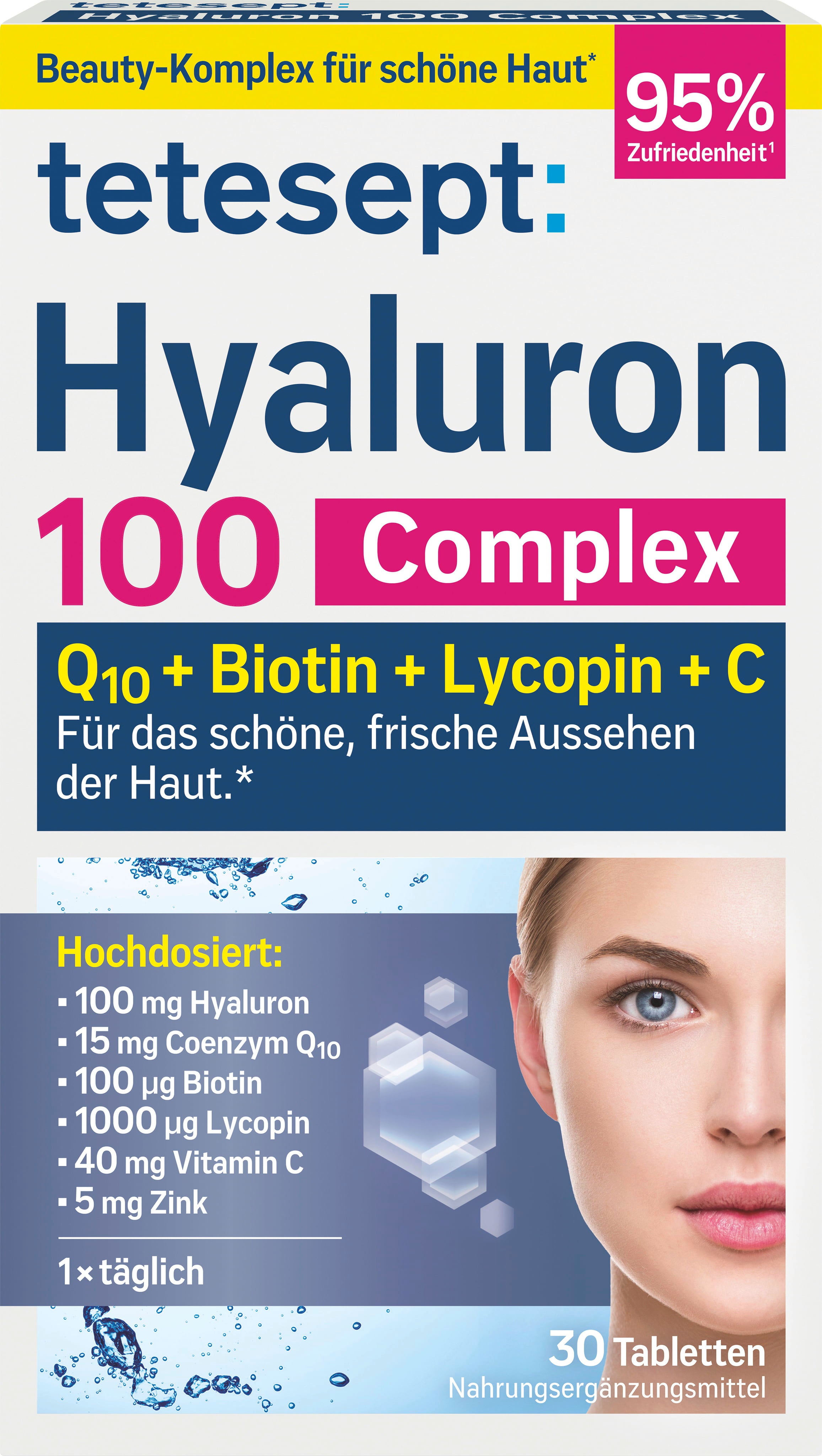 Hyaluron 100 Complex от tetesept съдържа не само хиалурон, но и други ценни съставки като Q10, биотин, цинк и ликопен. Таблетките са без глутен и лактоза и подпомагат множество процеси в организма.