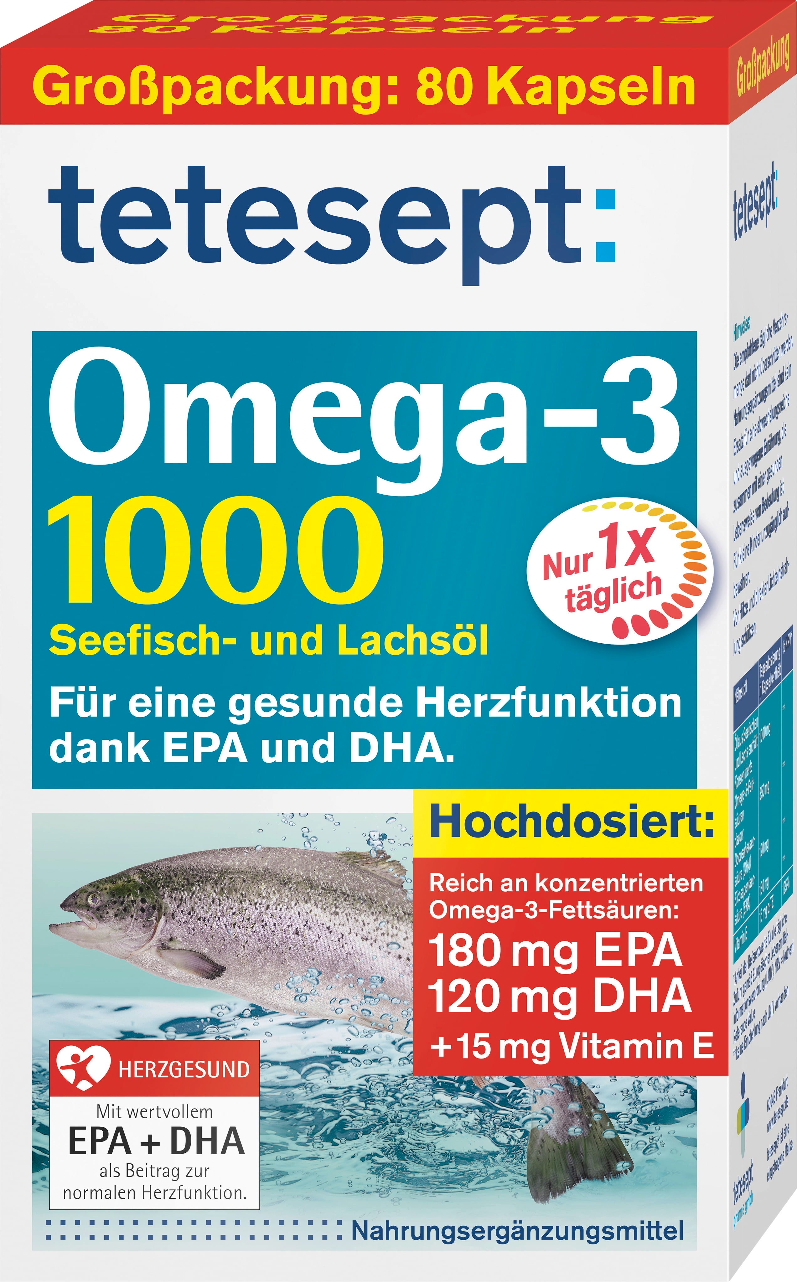 Омега-3 в тези капсули на tetesept е получено от морска риба и масло от сьомга. Понеже Омега-3 съдържа EPA и DHA, капсулите могат да подпомогнат организма. Допълнително е добавен витамин E, който оптимално допълва формулата. Капсулите са без глутен и лактоза.