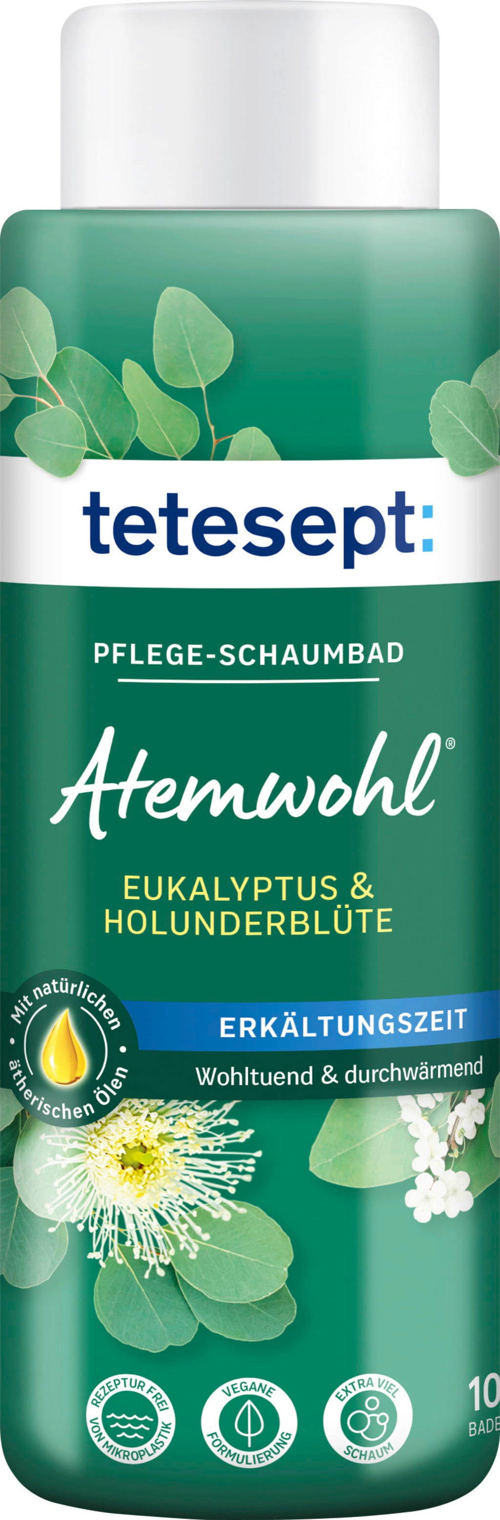 Pflegeschaumbad Atemwohl от tetesept е идеалното допълнение за влажно и студено време! Меката пяна се задържа екстра дълго и дарява кожата с допълнителна грижа, а ароматът на натурално евкалиптово масло и нежни цветове от бъз завършва изживяването във ваната.