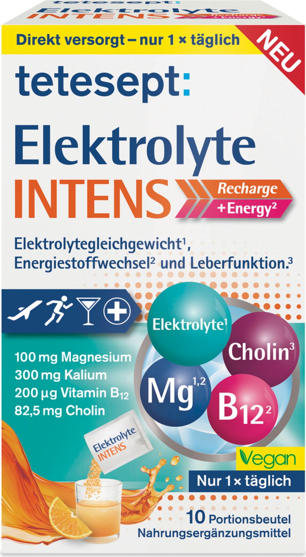Този електролитен прах от tetesept е в удобни порционни пакетчета за лесно приложение. Прахът съдържа между другото магнезий, калий, холин и витамин B12. Формулата е веган и прахът се разтваря лесно във вода.
