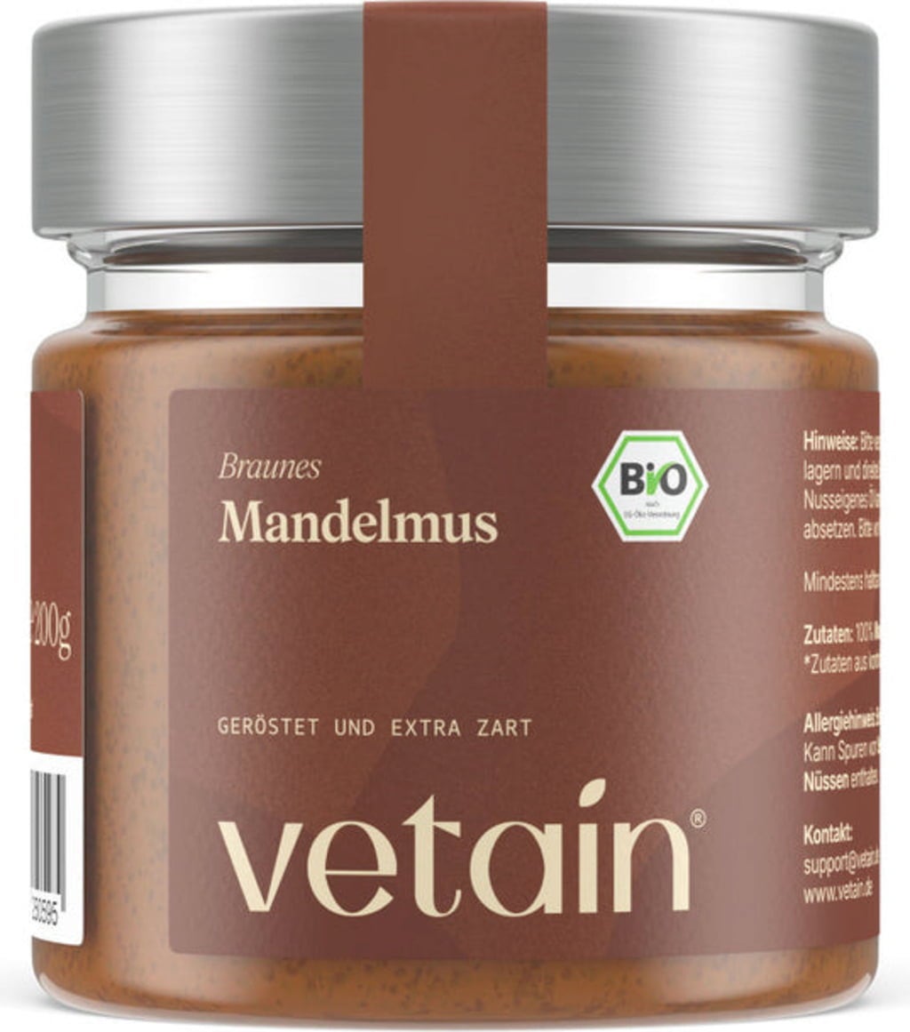 Кафявото био бадемово масло може да се използва директно върху хляб, в шейкове или в каша. То е направено от печени бадеми от Испания и не съдържа добавки, захар или палмово масло.