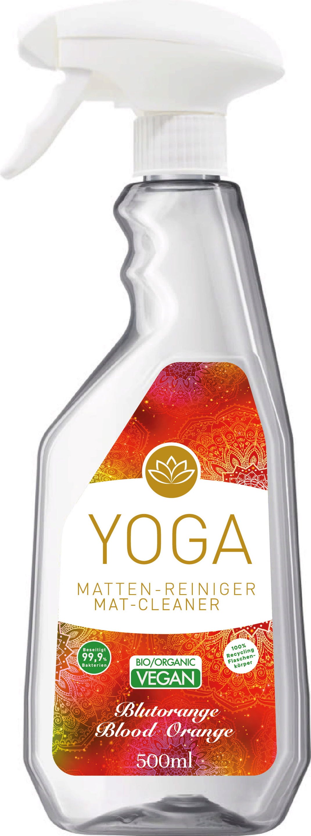 Този препарат е идеален за почистване на нехлъзгащи се йога постелки. Той е направен от рапично масло и естествено чисти етерични масла, както и от натурални вещества и е антибактериален. Той също така гарантира, че неприятните миризми, бактерии, остатъци от пот и мръсотия се отстраняват ефективно. Почиствателят за йога постелки изсъхва бързо и позволява на постелката да се навие бързо след почистване.
